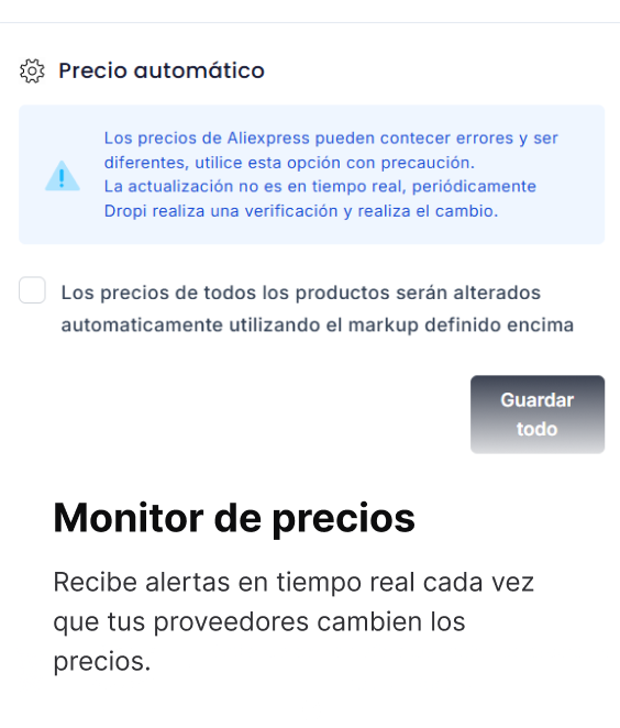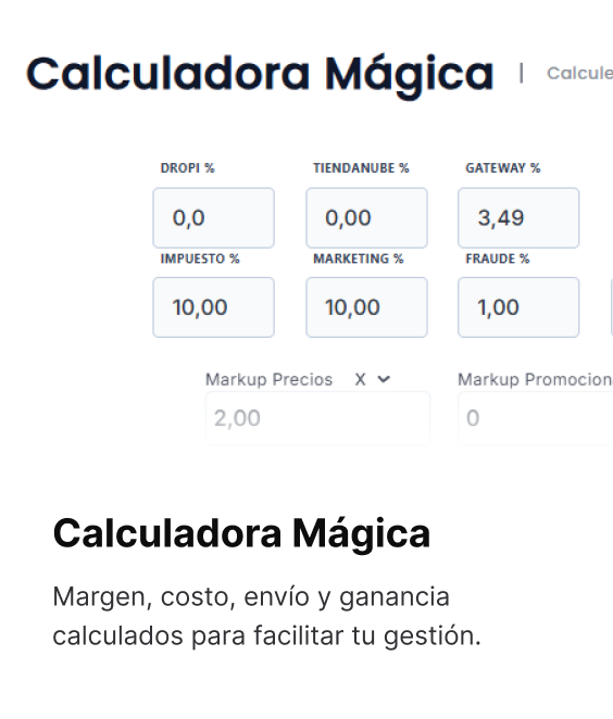 Dropi ofrece herramientas automáticas para ayudarte a definir el mejor precio de venta. Puedes configurar un markup general (por multiplicación o porcentaje de ganancia), y la app calcula el precio ideal considerando costos del proveedor, envío, tarifas y margen de ganancia. Esto agiliza tu operación y garantiza que cada venta sea rentable. Además, puedes ajustar los precios manualmente en cualquier momento.